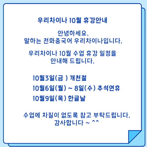 우리차이나 10월 휴강안내